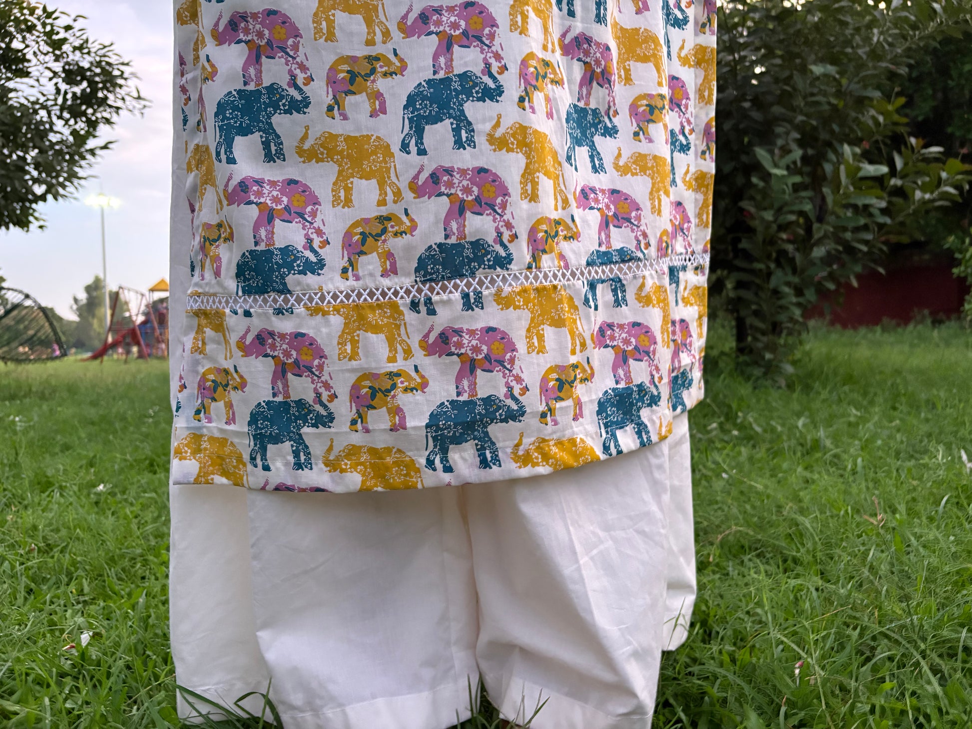 A celebration of tradition with a playful twist — Ashrafi is all about comfort, color, and charm. Crafted in soft cotton, this kurta features a lively multicolour elephant print, detailed with delicate lace inserts on the sleeves that add just the right touch of femininity.