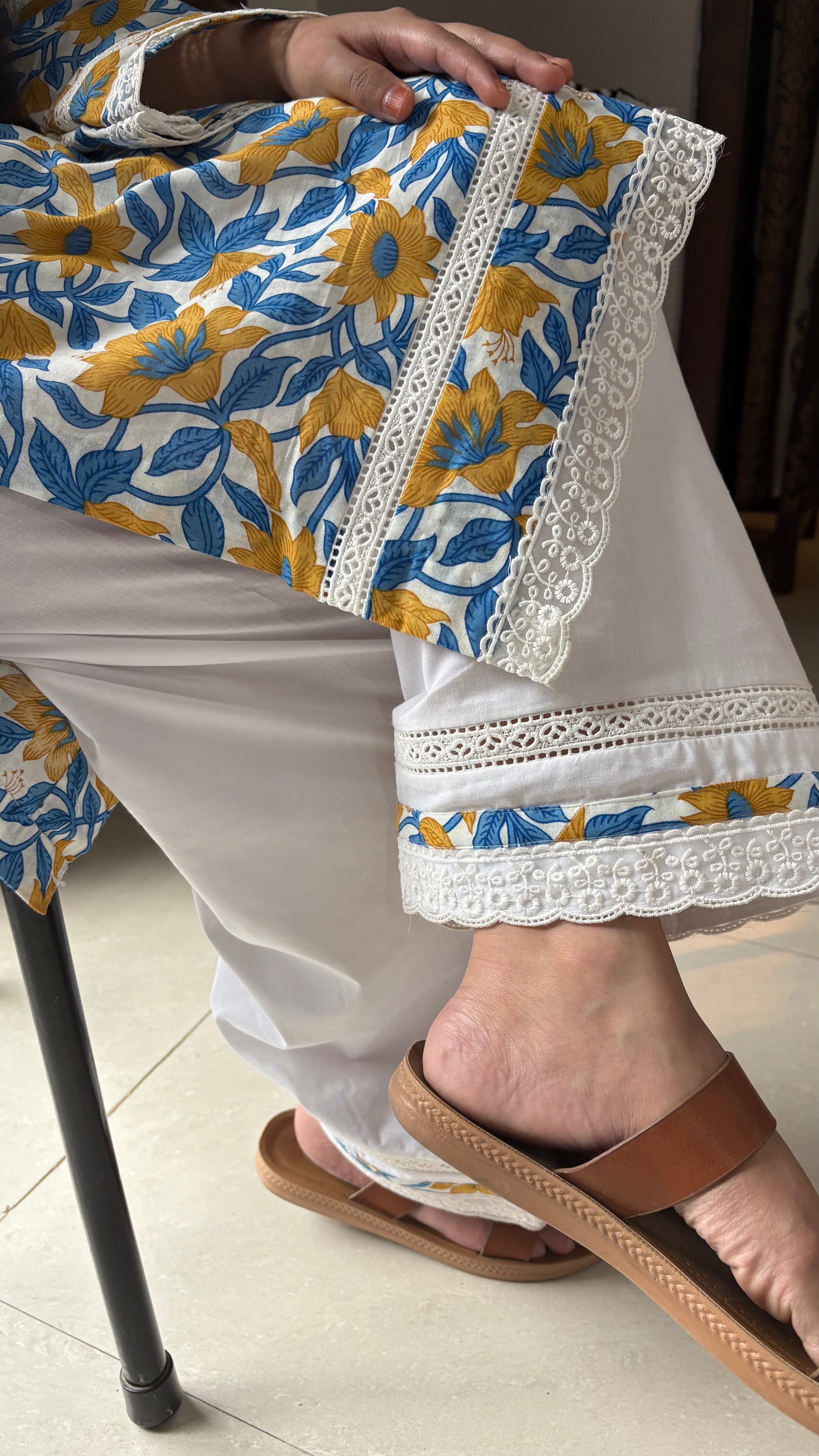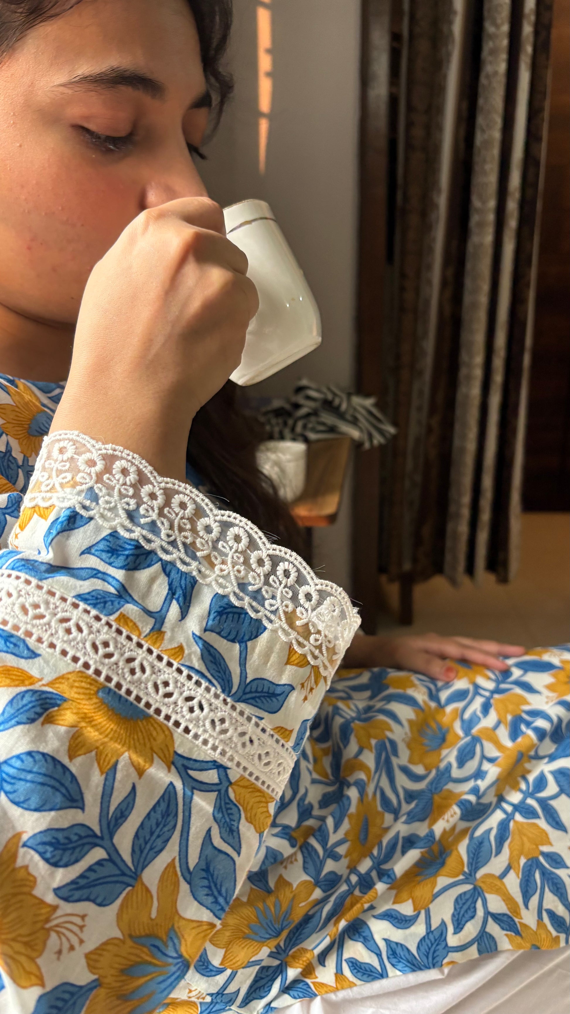 Bask in soft summer elegance with Nazaara Noon — a yellow and blue floral kurta set inspired by serene midday charm. Crafted in breathable cotton, this ensemble features blooming floral prints and delicate double lace sleeves that add a graceful, feminine touch.