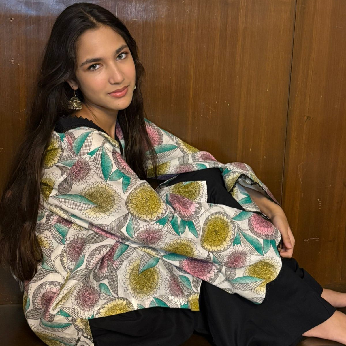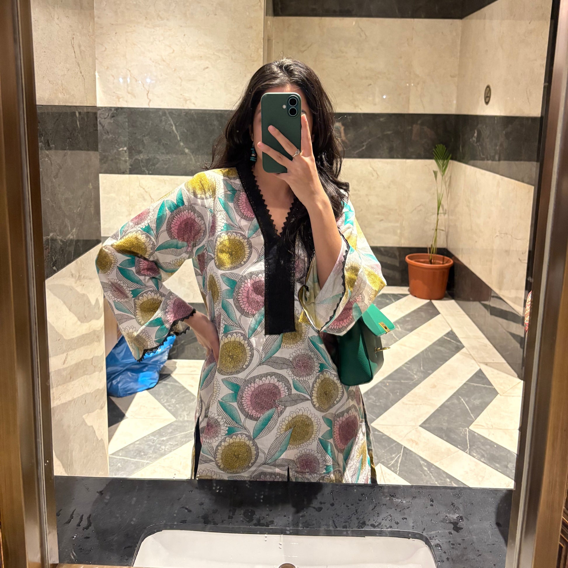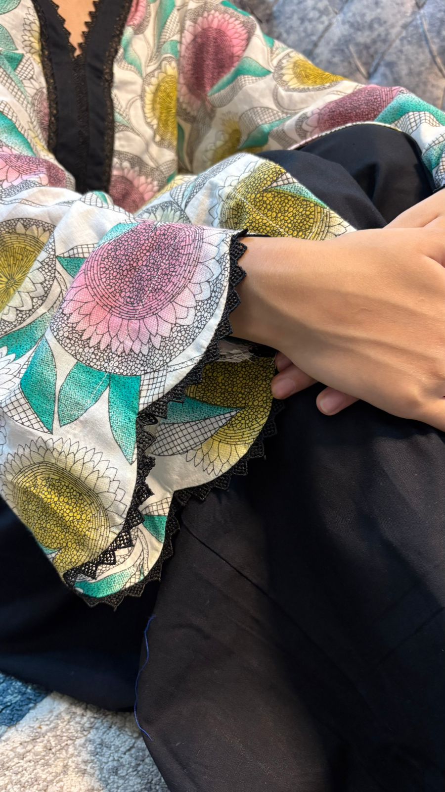Bold yet beautiful — Gulbaan is where timeless florals meet understated drama. This set features a delicately printed kurta adorned with blooming floral motifs, paired with a solid black cotton salwar that adds contrast and depth to the look.