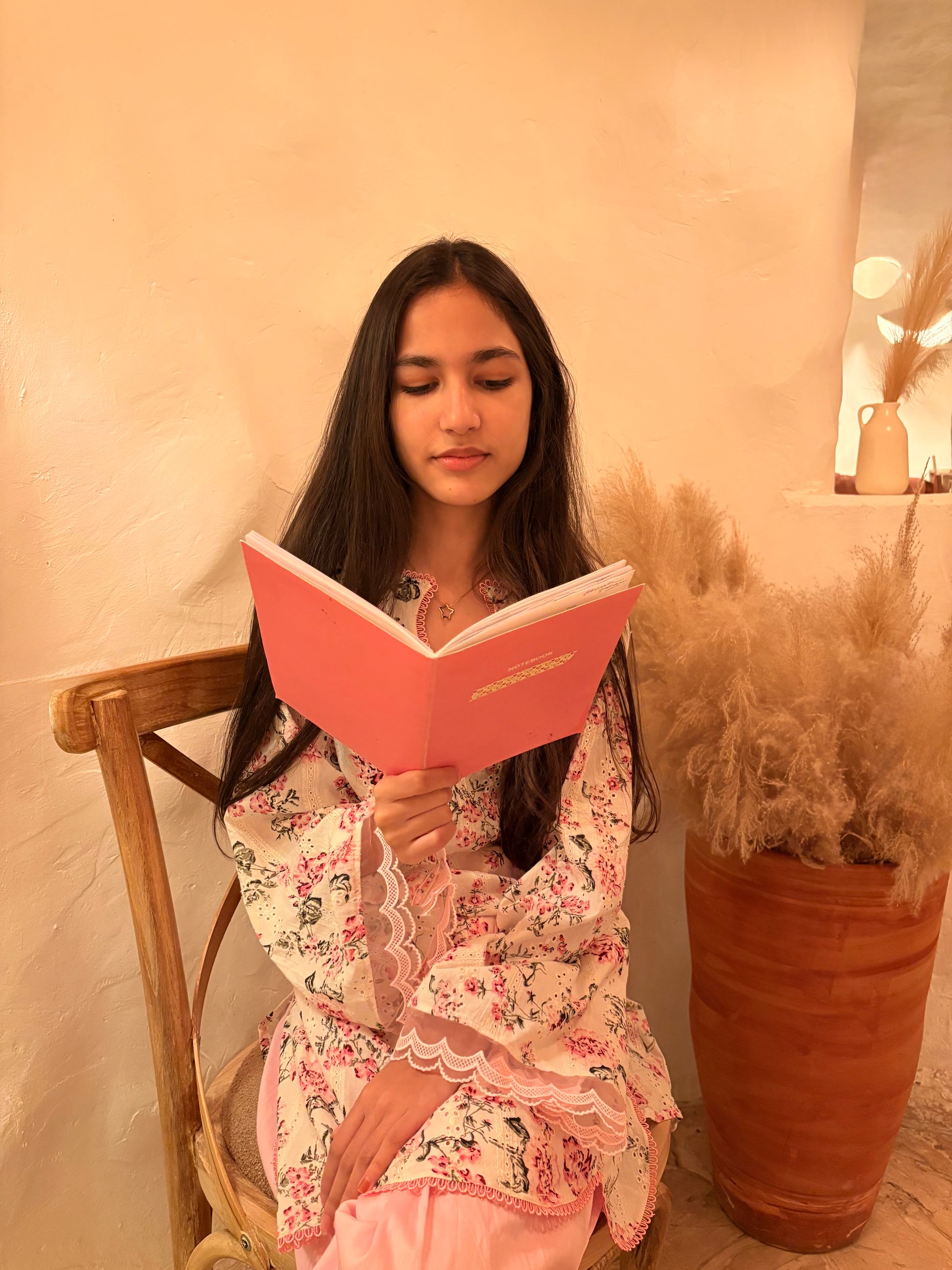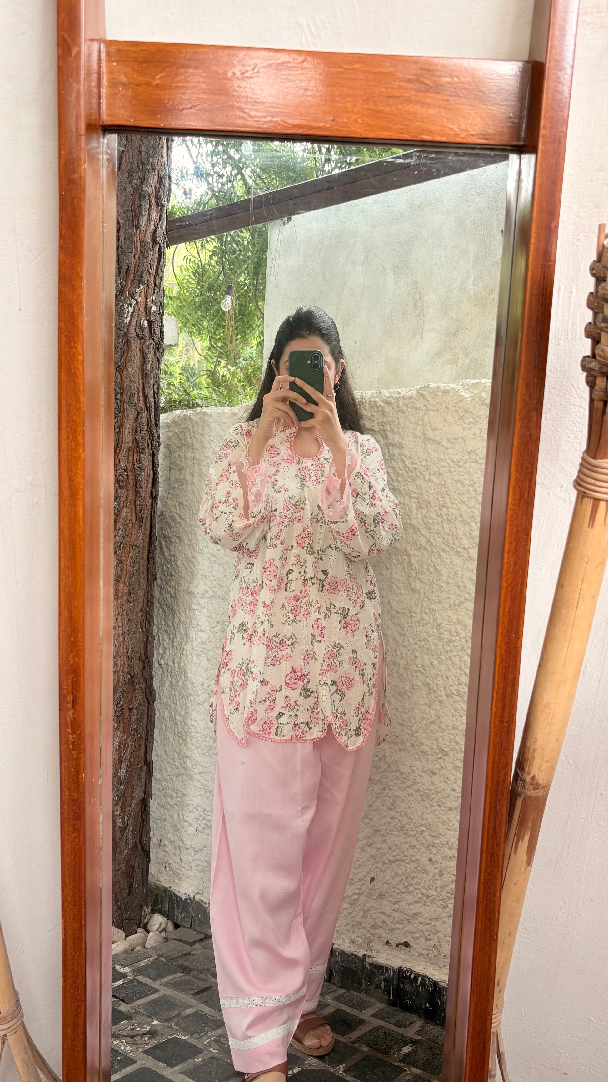 In a delicate shade of baby pink, Noori is crafted from Scallop Hakoba, known for its soft touch and graceful fall. The neckline is adorned with fine embroidery, while the hem of the kameez features intricate cutwork for an artisanal finish. Paired with a classic farsi salwar in matching tone, this set is the perfect harmony of elegance and comfort — ideal for both everyday wear and special occasions.
